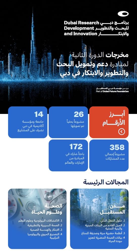 Dubai Future Foundation (DFF) has announced its support for 26 research projects led by 14 universities and academic institutions in Dubai, marking the conclusion of the second cycle of Dubai Research, Development and Innovation (RDI) Grant Initiative.
