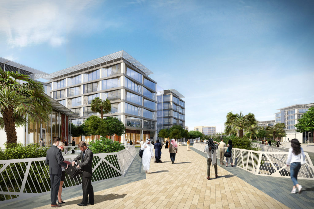 RMJM developed the masterplan, including 110,000sqm of offices and 90,000sqm of hospitality space. The parking is located in the basement to keep the ground level as pedestrian-friendly as possible, to encourage co-working and interaction between businesses at a human level. Small boutiques, offices and workshop cafes complete the landscape, creating a large connected central urban plaza at ground level. Meandering pedestrian passageways connect activity zones from all sides of the buildings. The idea behind these extensive pedestrian routes was to create movement throughout the development rather than concentrating it through single passageways. Paving materials are a mixture of natural stones and locally manufactured concrete, with lighter colours used for the main areas to reduce heat gain. Shade trees along walking routes and for seating areas, and a district cycle route along the periphery, promote outdoor use and walkability.