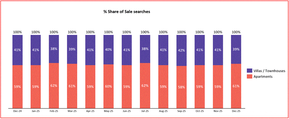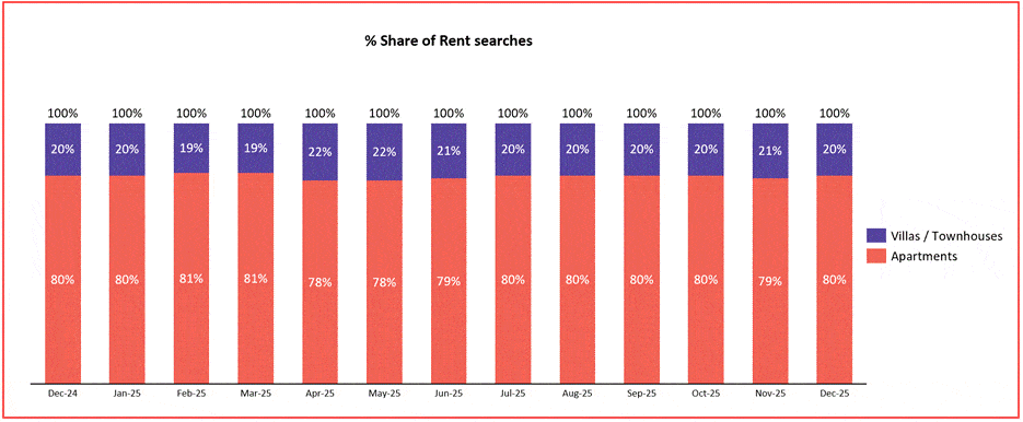 Within the apartment searches, 85% of searches are concentrated on studio, one-bedroom and two-bedroom units, again reflecting a trend towards home-seekers favouring small- to mid-sized, budget-friendly residences.