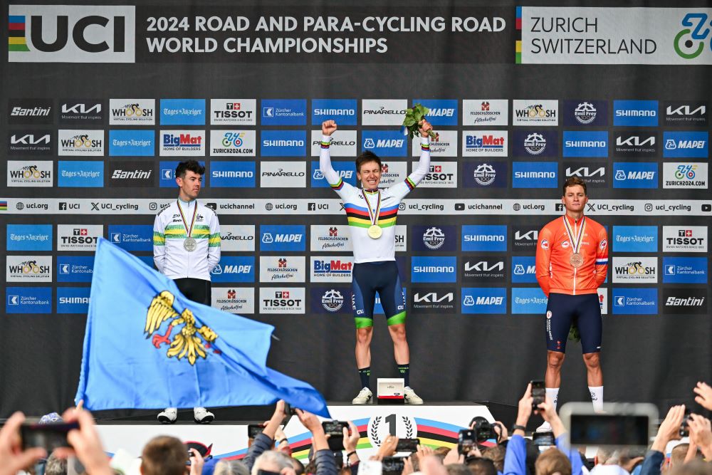 UAE Team Emirates’ Tadej Pogačar put in a monumental ride at the World Championships road race in Zurich, Switzerland with the 26-year-old staying away solo after more than 100km on the attack. Second was the Australian Ben O’Connor (Australia) +34” and third was Mathieu Van Der Poel (Netherlands) +58”.
